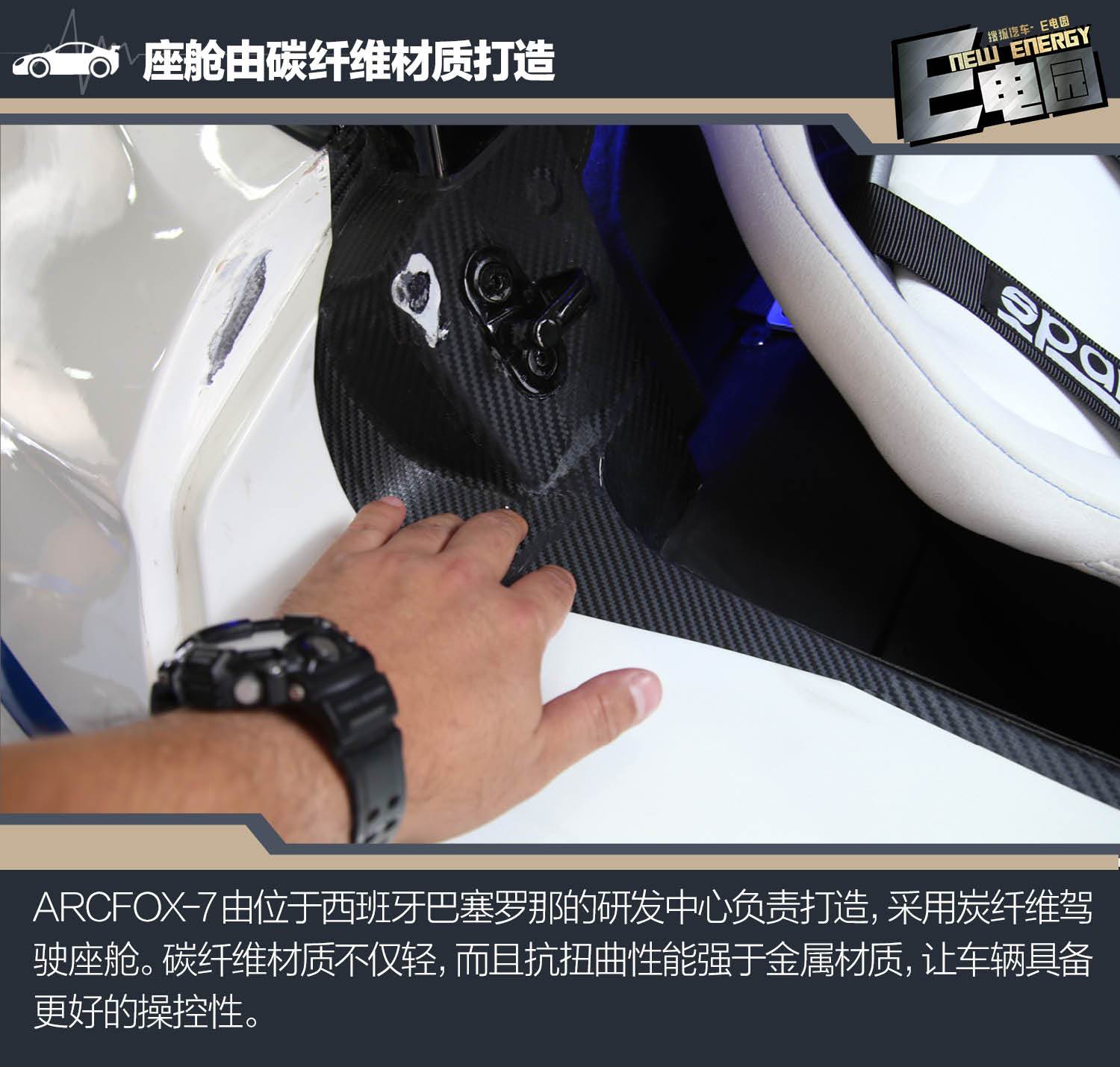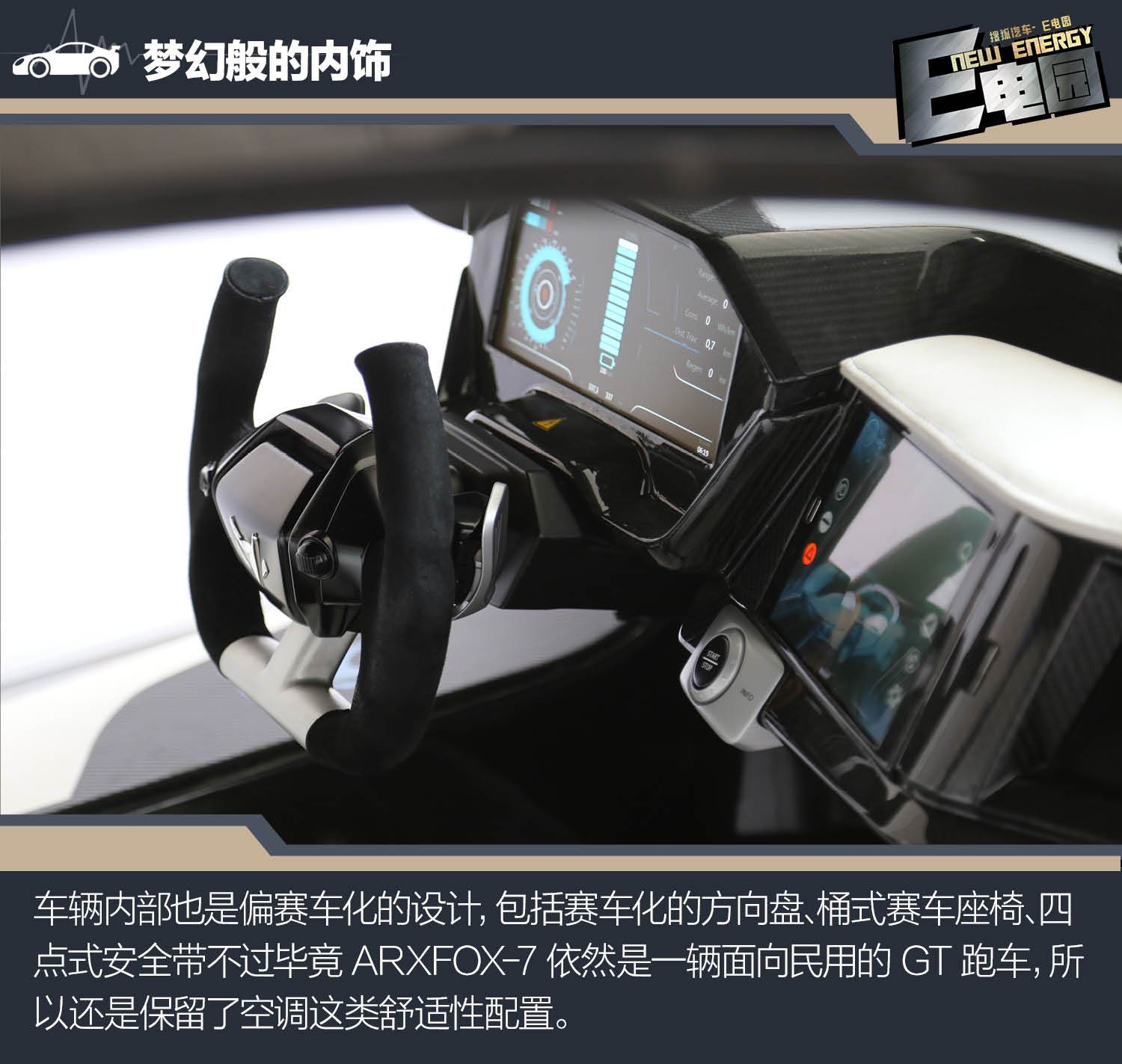 從內(nèi)飾就可以看出 ARCFOX-7 采用都是炭纖維座艙,內(nèi)部也是偏賽車化的設(shè)計(jì),包括賽車化的方向盤、桶式賽車座椅、四點(diǎn)式安全帶不過畢竟 ARXFOX-7 依然是一輛面向民用的 GT 跑車,所以還是保留了空調(diào)這類舒適性配置。